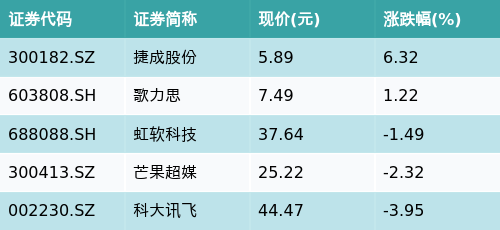 规矩收盘欧洲杯体育,造谣数字东谈主主题涨跌幅最高的五只股票为:捷成股份(300182.SZ)、歌力念念(603808.SH)、虹软科技(688088.SH)、芒果超媒(300413.SZ)与科大讯飞(002230.SZ)。服气见下表: