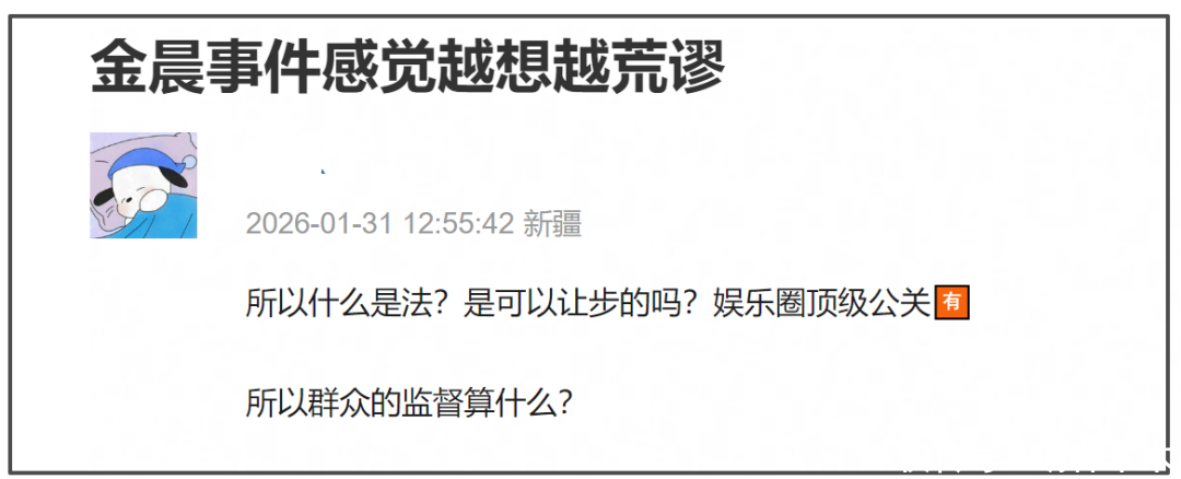 彰着金晨的恢复和通报,很难平息后续争议。此次明星逃遁顶包风云中,不仅事故包袱东谈主金晨应该实时发文谈歉,也应该公开对金晨的相关管理,让各人监督,亦然让大众引合计戒。