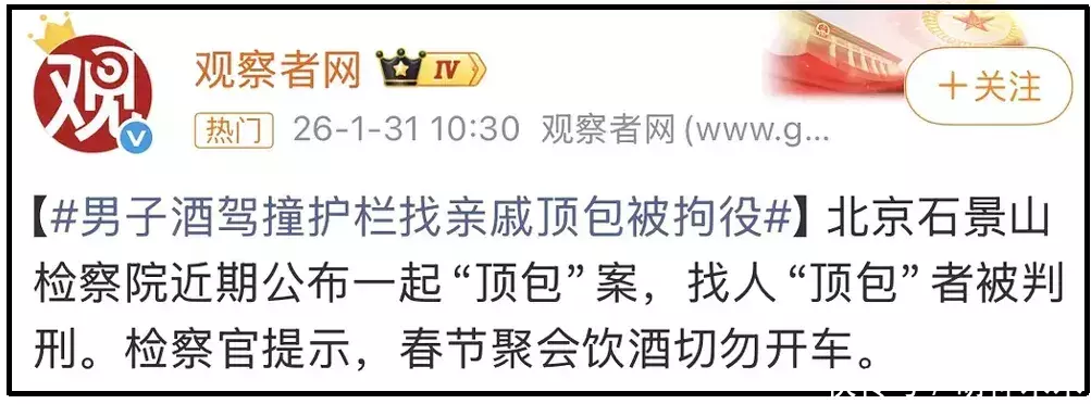 不雅察者网也报谈了一则案例,某男人酒驾撞护栏找亲戚顶包被拘役。