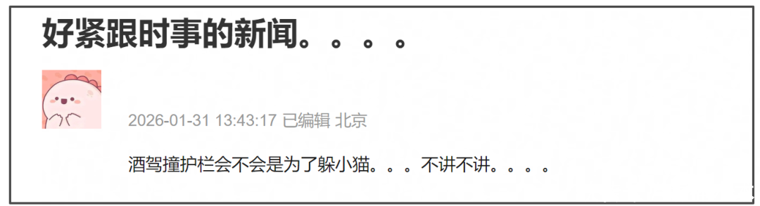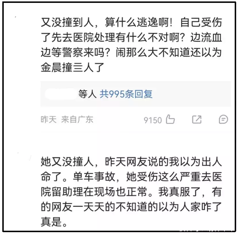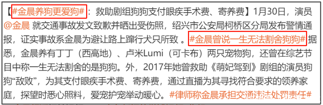 以致还疑似出现深广水军洗白,说金晨一直惊叹小动物,因为路上一会儿窜出小狗,金晨为了遁入才发闯祸故,“又莫得撞到东谈主”,“受伤了先去病院不算逃遁”。还有媒体互助发声,宣传金晨养狗更爱狗。