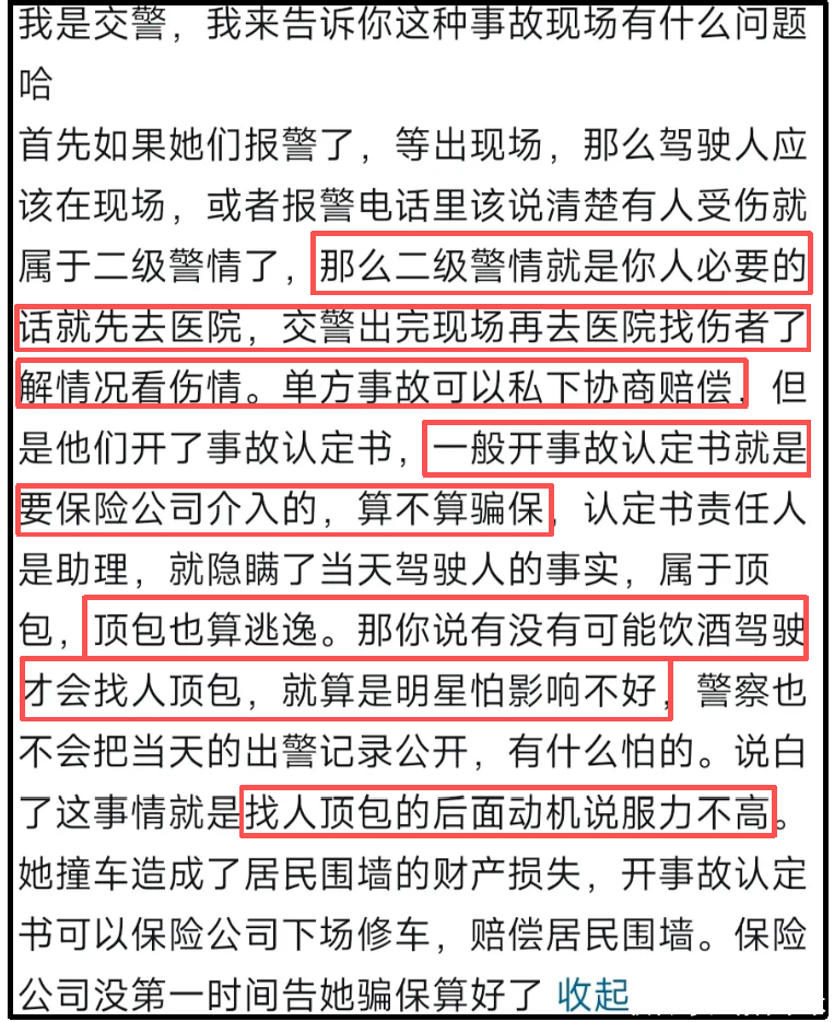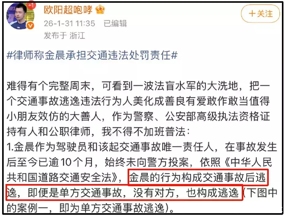 也曾有业内站出来针对金晨的事件伸开普法询查,这位业内不是别东谈主,恰是作念过窥探的前《仙葩说》选手。他直言金晨的行径组成交通事故后逃遁。金晨看成驾驶员和事故中的惟一包袱东谈主,在事故后十多个月,耐久莫得向警方投案,也曾组成逃遁。