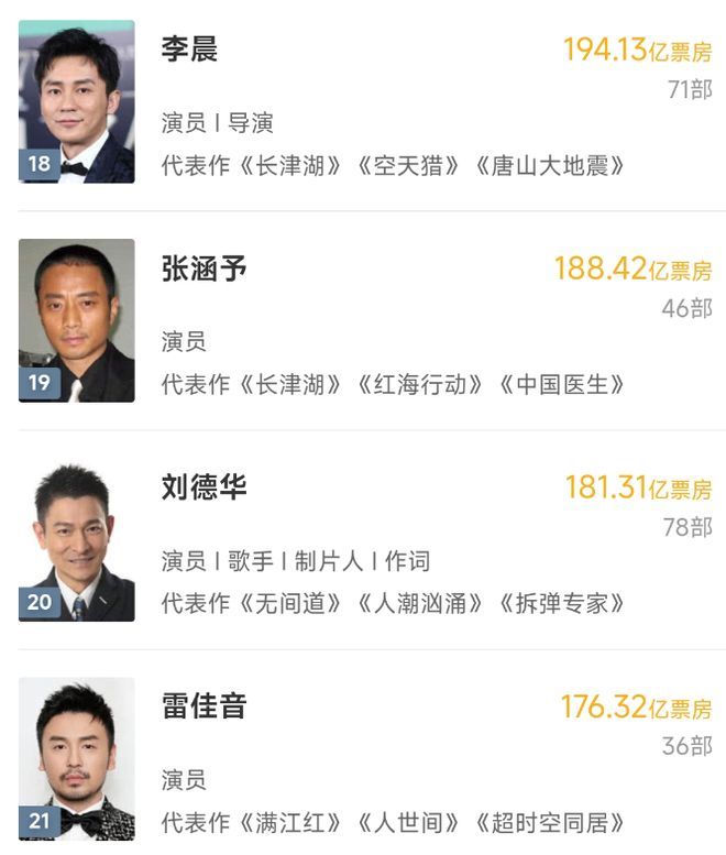 万万没猜想李晨竟然能凭借194亿的主演票房排在榜单18位。