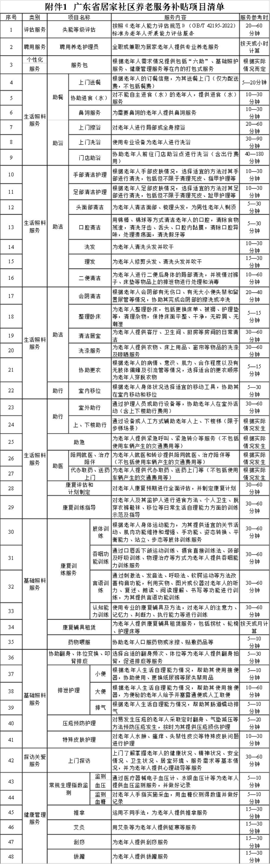 本次补贴名堂包括居家、社区、机构养老劳动,其中居家、社区养老劳动包括助餐、助浴、助洁、助行、助急、助医、康复照管、白昼托养等劳动(具体参见《广东省居家社区养老劳动补贴名堂清单》),机构养老劳动包括恒久劳动(入住≥30天)和短期喘气劳动(入住<30天)等。